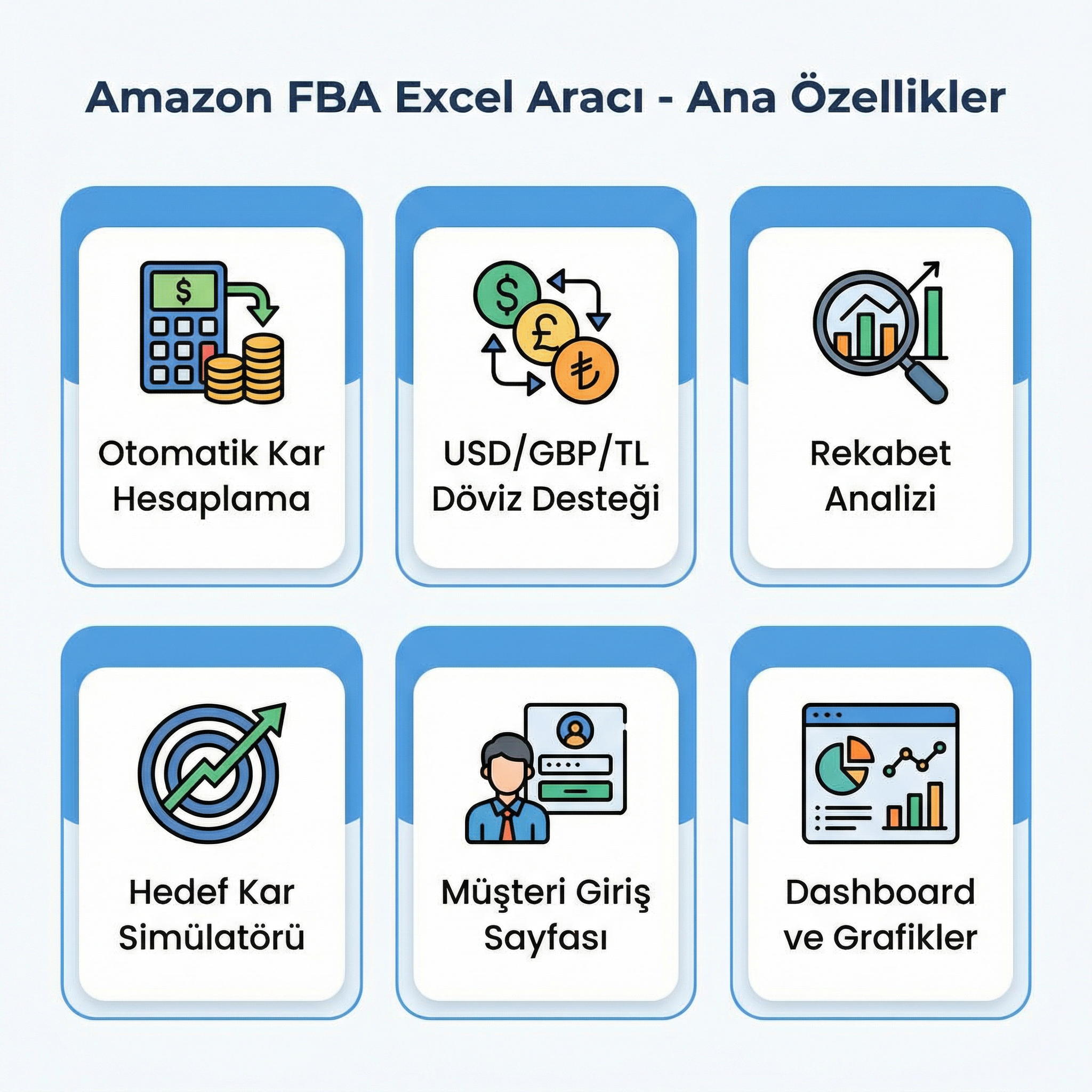 Amazon ürün araştırma Excel, satışa başlamadan önce bir ürünün gerçekten kazandırıp kazandırmayacağını anlamanız için tasarlanmış gelişmiş bir analiz aracıdır. Kâr hesaplama, FBA maliyetleri, ROI oranı, satış tahmini ve rekabet değerlendirmesi tek dosyada otomatik olarak yapılır.